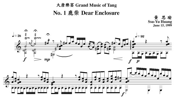 | | | Grand Music of Tang, No. 1. Deer Enclosure Duration: approximately 4'15" The classical guitar score in PDF will be emailed to you within 24 hours upon receiving the amount of payment shown on the right. The "buy now" button on the left will bring you to a secured website where you can pay with PayPal or a major credit card. | US$ 10.00 | | Grand Music of Tang is a suite of 24 classical guitar pieces, each of which was inspired by a specific poem from the Tang Dynasty of China (618-907 AD). This work was commissioned by Japanese classical guitarist Mr. Kazuhito Yamashita in 1999. For No. 1. Deer Enclosure, the poem in Chinese and its English translation are shown below. | | 鹿 柴 (王維) 空山不見人, 但聞人語響。 返景入深林, 復照青苔上。 | Deer Enclosure (Wang Wei, 699-761 AD, China) In empty mountains not a soul in sight, Yet I hear echoes of people talking on site. Through thick woods comes dim twilight; Its reflection on green moss seems so bright. | | Audio Clip:  Score sample: | |